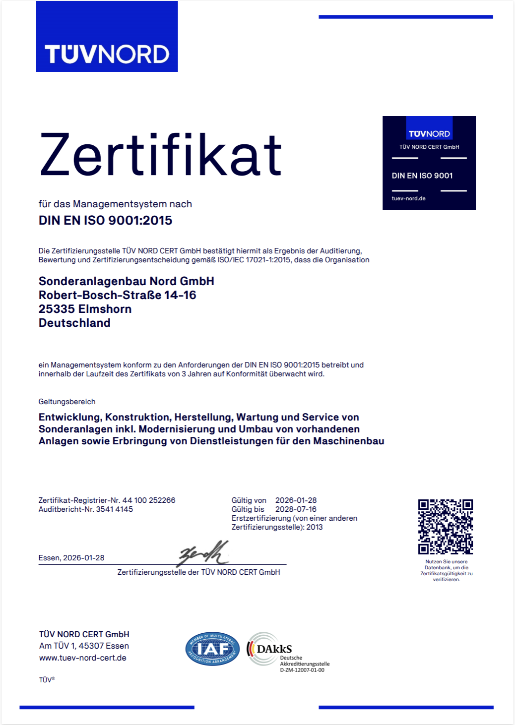 SAB bietet prozesssicheren Sondermaschinenbau und ist nach ISO 9001:2015 zertifiziert.